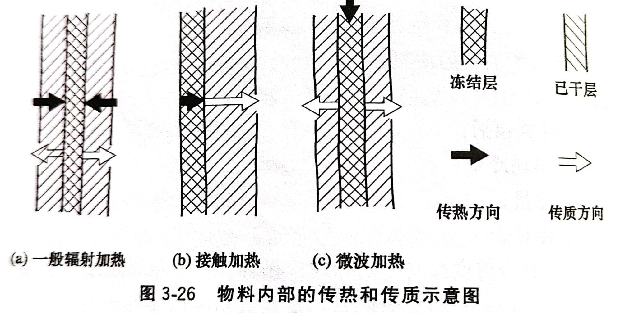 利用传导或辐射加热时,在被干燥的物料层中传热和传质的相对方向有所不同。从图3-26可见,辐射加热时被干燥物料的加热是通过外部辐射源向已干层表面照射来进行的。传到表面上的热量,以传导的方式通过已干层到达升华前沿,然后被正在升华的冰晶所吸收。升华出来的水蒸气通过已干层向外传递,达到外部空间。传热和传质的方向是相反的,内部冻结层的温度决定于传热和传质的平衡。一般辐射加热的特点是:随着干燥过程中升华表面向内退缩,已干层的厚度愈来愈厚,传热和传质阻力两者都同时增加,如图3-26(a)所示。图3-26(b)是接触加热时所发生的情况。在干燥进行中,热量通过冻结层的传导到达升华前沿,而升华了的水蒸气则透过已干层逸出到外部空间。因此,传热和传质的途径不一,而传递的方向是相同的。界面的温度也决定于传热和传质的平衡。随升华表面不断向内退缩,已干层就愈来愈厚,冻结层愈来愈薄,因而相应的传质阻力愈来愈大,传热的阻力愈来愈小。图3-26(c)是微波加热的情形。微波加热时热量是在整个物料层内部发生的,冻结层要发热,已干层也要加热。但由于这两层的介电常数和介质损耗不同,发生在冻干层内的热量要多得多。内部发生的热量被升华中的水吸收,故所供之热量不需传递,传质是在已干层内,方向是相反的。