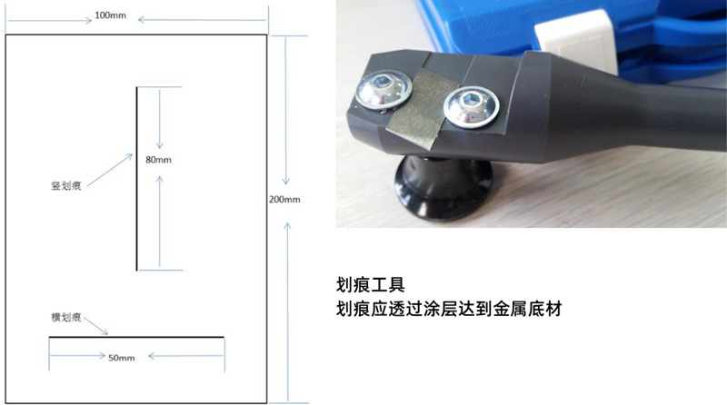 在53种试验样板中,选取其中一种进行试验,如N0.46,样板宽为100mm,长为200mm。底材是铝板,进行磷化前处理,电泳涂层厚度是18um,面漆是白色的,其中中涂涂层厚度为30um,色漆涂层厚度为15um,清漆涂层厚度为35um。在试验前对样板进行划痕(划痕应透过涂层达到金属底材)。