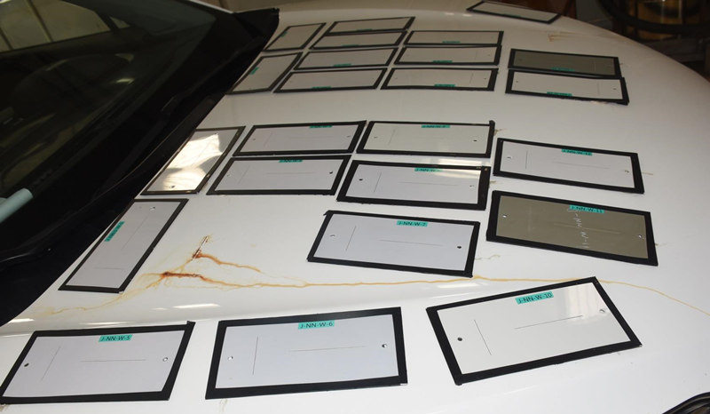 把样板贴在车身上进行120天的道路强化腐蚀试验。如图司涂层样板道路强化腐蚀试验结果,如图可以看到划痕处发生腐蚀。