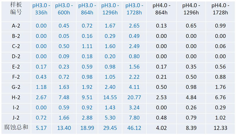 第一轮CATCH腐蚀试验中,ph值为4.0,在第二轮CATCH腐蚀试验中,降低ph为3.0,计算腐蚀面积。