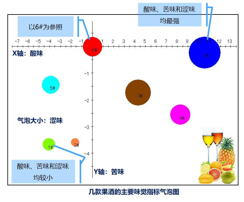 日本INSENT电子舌用于果酒滋味的检测,以6#为参照,其他样品均与其比较。主要对几款果酒的酸味、苦味和涩味进行比较,从图中可见,7个果酒产品在味道上差异明显。可见例如2#酸味、涩味和苦味均最大;1#和3#则是酸味、涩味和苦味均很小,每个产品的味道特征都可以非常清晰的直接展示出来。