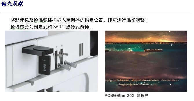 机型向奥林巴斯BX51看齐;多档分光比观察头设计全新RX50M系列观察筒,采用宽光束成像系统设计,支持26.5mm的超宽视野观察,带给您全新的大视野体验。两档式正像铰链三目观察筒,保证样品的移动方向与您通过目镜观察到的方向一致,使操作更加得心应手。三档式铰链三目观察筒,在成像光线用于双目观察或三目摄影的基础上,增加一档20%用于双目观察,80%用于显微摄影,方便用户同时对镜下图像与视频图像进行对比观察;偏振系统偏振系统包括起偏器和检偏器,可做偏光检测,在半导体和PCB检测中,可消除杂光,细节更清楚。检偏器分为固定式检偏器和360度旋转式检偏器。360°旋转式检偏器可在不移动标本的情况下,方便的观察标本在不同偏振角度光线下呈现的状态。可在偏振系统的基础上加载舜宇全新研发微分干涉器,建立诺曼尔斯基微分干涉衬比系统。