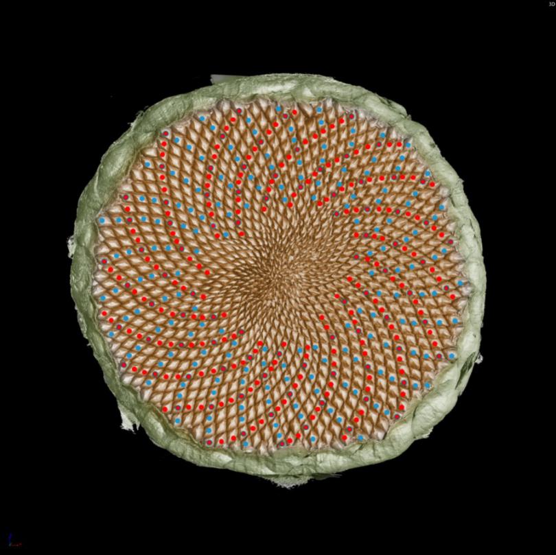 先来一张CT扫描的向日葵三维模型图,是不是感觉葵花种子的排列非常的紧密而有规律呢?向日葵圆盘的种子按照一定的发散角螺旋排列使得种子之间没有间隙,空间得到充分的利用,这其中便蕴含着数学奥秘。