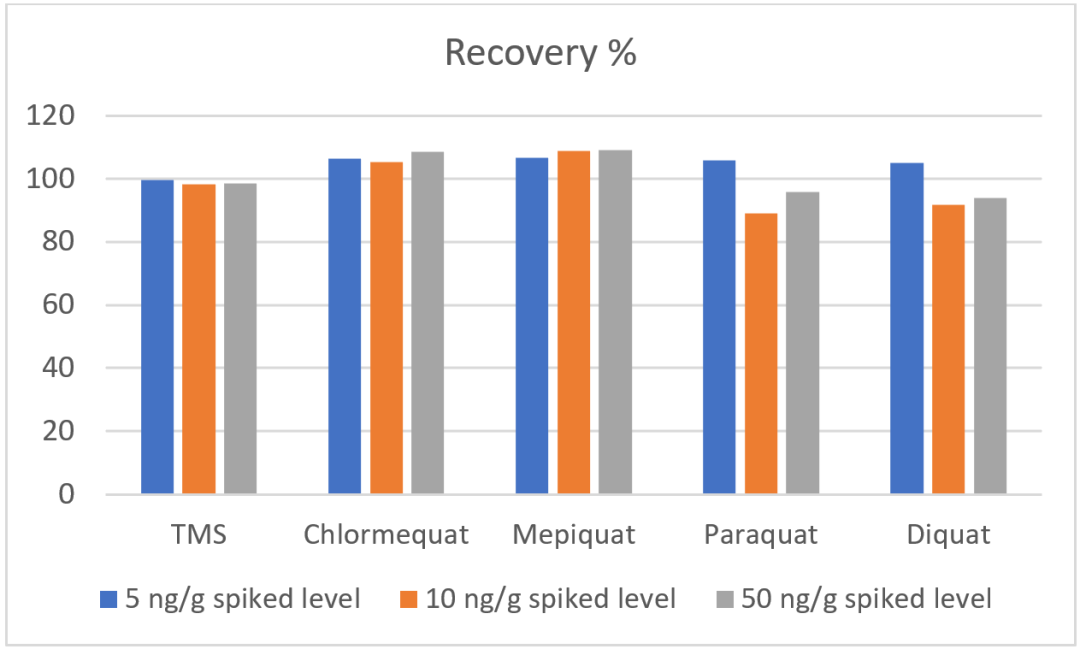 依照欧盟SANTE 12682/2019中的规定,所得全部结果都与该规定一致,满足回收率70%-120%,重复性RSDs小于20%。限量Z低的百草枯在GB2763-2019中的规定是:浆果类和小型水果类为0.01 mg/kg。验证工作选取了草莓为基质,以0.005 mg/kg为Z低加标验证浓度。