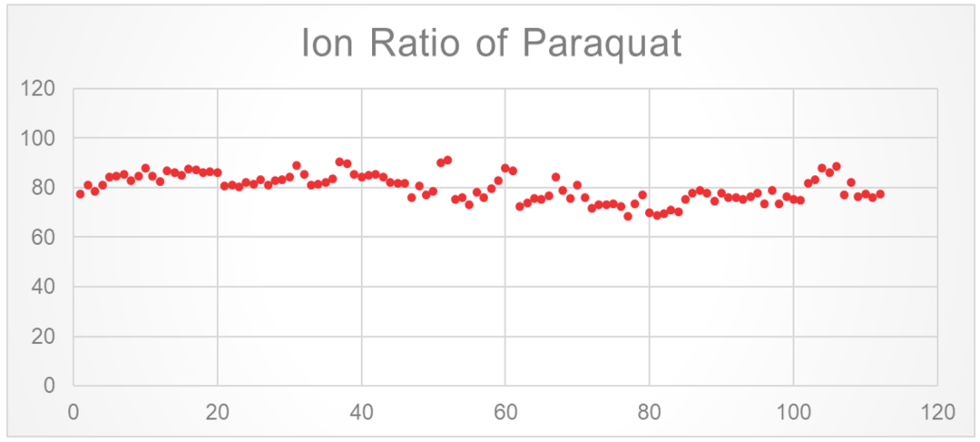 经过优化的前处理过程,可以有效去除样品基质,维持系统长时间稳定,有效延长耗材使用寿命。草莓基质下的百草枯,超过100针进样的离子对比例如下图所示: