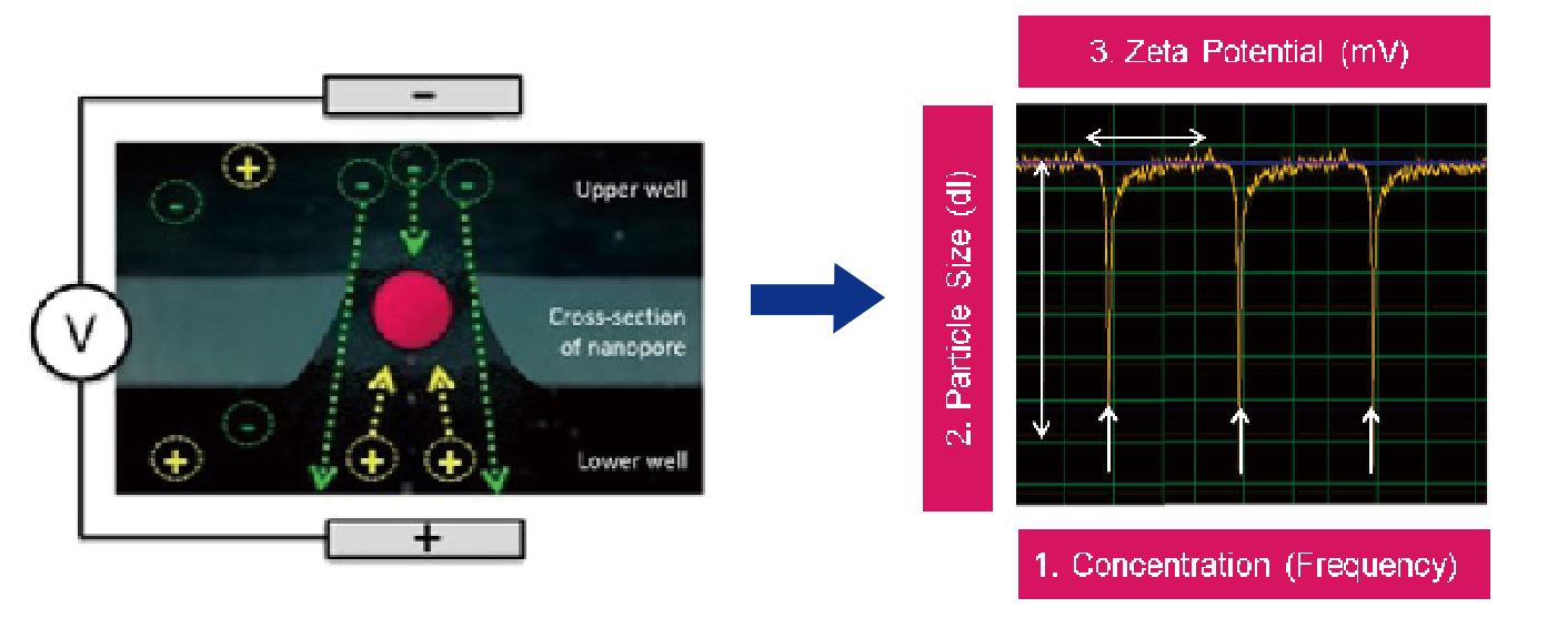 TRPS技术基于阻抗原理,与激光无关。当充满电解液的纳米孔上下两边施加一定的电压时,纳米孔内会产生离子电流。当颗粒通过纳米孔会取代一定的电解液增加电阻,继而产生电阻脉冲信号,该脉冲信号大小与颗粒的体积成正比。