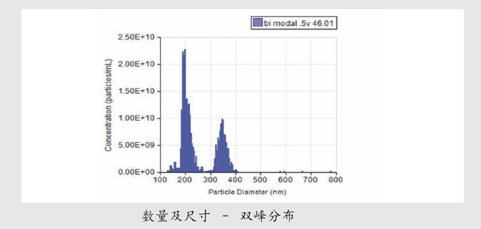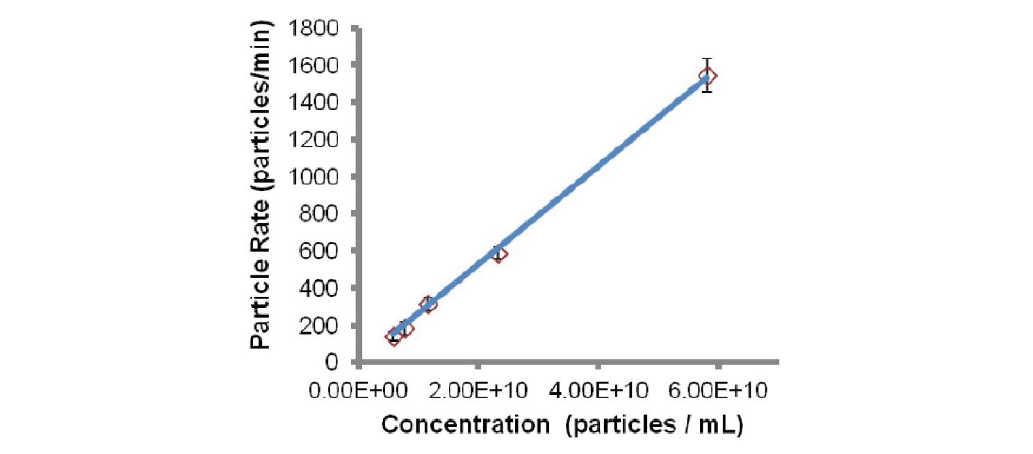 TRPS技术能获得非常准确的浓度信息:颗粒速度与浓度成正比关系,与颗粒组成无关,因此,一定尺寸范围内的颗粒浓度(Cmin-Cmax)可通过已知浓度的标准曲线计算得到。对于一张完整的数据图,需要同时提供颗粒浓度和尺寸分布,然而许多应用中,提供更简单的数据也同样合适。TRPS利用简单且可验证的方法提供准确、可靠的浓度。
