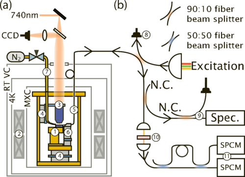 量子网络节点的实现是未来量子网络乃至量子互联网的基本要求。这样的量子寄存器在不干扰底层量子状态的情况下负责接收或发射信息。近期,美国哈瓦德大学(Cambridge,MA,USA)的Marko Loncar和Mikhail Lukin小组提出了基于金刚石纳米腔中硅空位色心的基本量子网络节点。课题组在稀释制冷机中采用德国attocube的极低温纳米位移器ANPxyz101和atocube的低温复色差物镜搭建的极低温mK共聚焦显微镜,对金刚石晶格中的光学活性点缺陷进行了表征。此外,作者还通过将系统耦合到入射光光子以及附近具有100 ms退相干时间的核自旋来演示作为量子寄存器节点的工作原理。使量子中继器迈出了坚实的一步。
