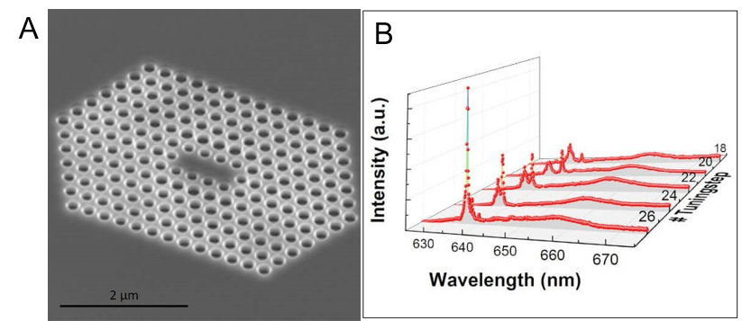 T. Jung, et al; "Spin Measurements of NV Centers Coupled to a Photonic Crystal Cavity", arXiv:1907.07602 (2019)图一、A 实验制备的可调谐的二维光子晶体腔体;B 在637.4 nm处M0腔模式和NV-ZPL的相互作用