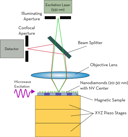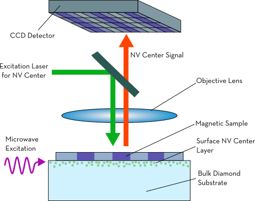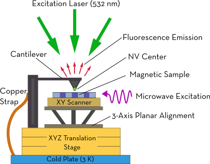 将一个NV色心固定在扫描探针显微镜的探针末端。可以通过在针尖上“粘贴”纳米金刚石,或采用纳米压印与O2刻蚀技术将块体金刚石加工成再用N-14注入来实现NV色心,现在甚至已经有商业化的针尖。采用共聚焦显微镜将激发光聚焦在扫描探针的NV色心上。实验中样品的准确扫描是通过attocube公司的低温纳米精度位移台进行。这样便可实现对样品表面的纳米级精度大范围成像测量。该技术理论上可以对多种与NV色心荧光相关的特性进行高精度显微学测量。