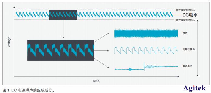 首先,我们在整体上看一下低噪声纹波探头及其部分特点。非常重要的一点,是要看一下每条 DC 线路,看提供的功率是否位于目标系统或器件的容差频段内,包括线路的标称 DC 值,以及存在的任何AC噪声或耦合。AC噪声是一种低噪声纹波探头信号,可以进一步细分成宽带噪声、周期性事件和瞬态事件 ( 图 1)。