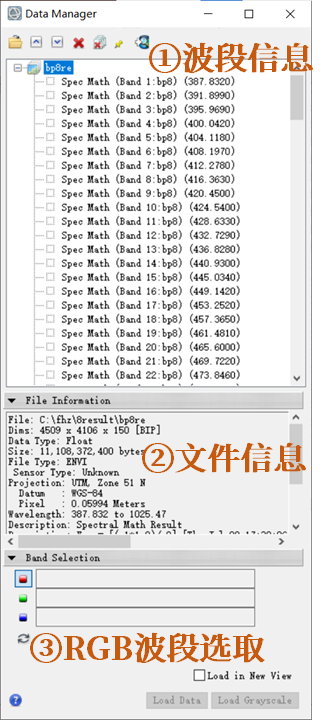 该窗口包含三个部分,分别是①波段信息、②文件信息、③RGB波段选取。①中展示了所有波段的名称,②中是经过处理后的头文件信息,③是进行RGB合成的波段选取,点击三种颜色的方框后,在①中单击选择波段,选择完成后点击Load Data。如果只想要显示一个波段的灰度影响可以在①中选中目标波段后直接点击Load Greyscale。