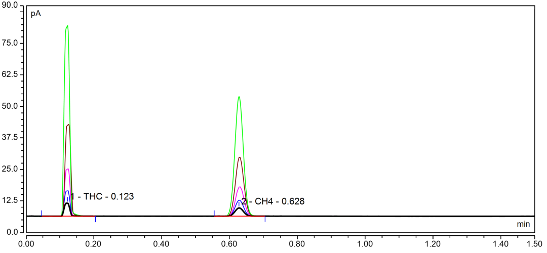 图2:低浓度总烃及甲烷5个浓度点叠加谱图