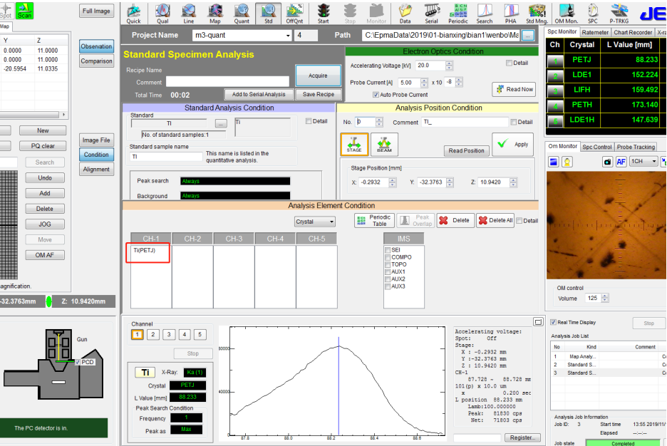 ⚫ 将 Ti 的标样进行标样检测,电子光学条件同上,如下图所示: