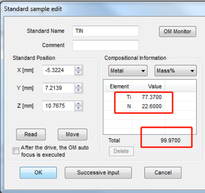⚫ 录入 Ti 的标样和 N 的标样信息,注意:准确找到标准样品位置,将十字叉丝调节清晰,录入标准样品的名称,成份信息,以及位置信息