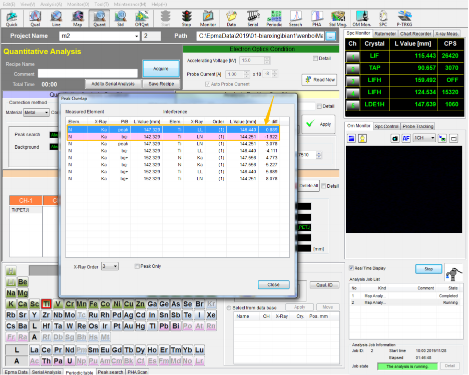 上图是待测样品 TiN 的电子探针分析图。右上图为 LIH 晶体测得的 Ti 的主线系 Ti Kα, 左上图为使用 LDE1 晶体测得的 N Kα 谱图(红色为 N 的谱图,黑色为 Ti 的次级线系Ti Ll 和 Ti Ln 的谱图,以下简称为 Ti Ll 谱图)。左上图中黄色线段是 Ti 的“贡献”,是需要扣除的,我们称之为“干扰峰强度”,红色线段是我们所需要的 N 的真实峰值,我们称之为“待测元素实际强度”。