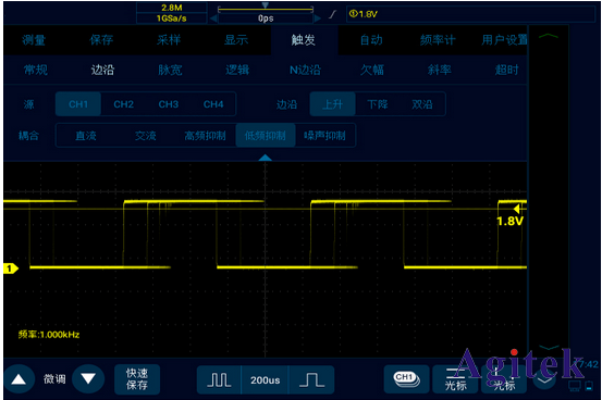 类似通道耦合,当选择直流耦合的时候,直流分量和交流分量都能通过触发。选择交流耦合的时候,示波器会滤除触发信号中的直流成分。高频抑制会抑制触发信号中高于50KHz的信号,低频抑制会抑制触发信号中低于50KHz的信号,而噪声抑制,是用低灵敏度的直流耦合来抑制触发信号中的高频噪声。我们来看下面这个信号: