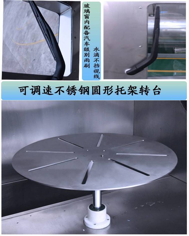 2.箱体门为有机玻璃,采用硅橡胶密封,有较好的密封性能,门上装有雨刮器便于观察试验情况。