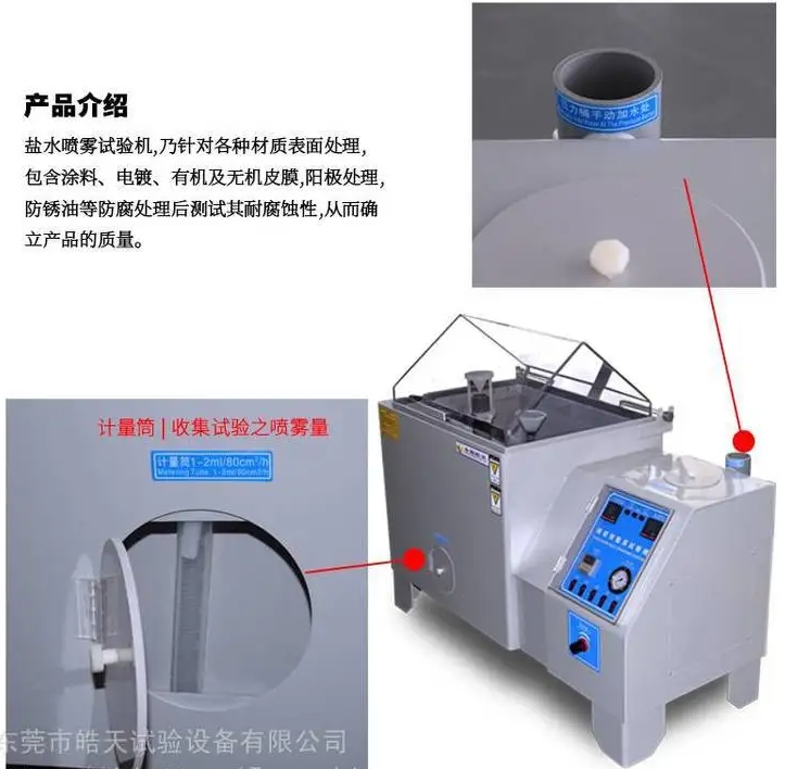 3、收集器:喷嘴所喷出的细雾,以自由落体方式沉降,内置一个或数个表面积80cm2的漏斗杯收集盐雾,凝结成水后由导管流至箱体外部的计量筒内;