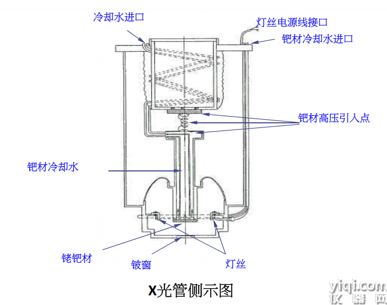 X光管前方为一高真空腔,高压由上方的高压线供应+40KV到前方的铑材质的钯材(Rh Target)上,并在前方一对灯丝上供应AC12V电压。此时灯丝会游离出带负电的热电子并受钯材上的正高压吸引而撞击钯材并激发出钯材物质所带有的特征X射线,最 后经由前方铍窗射出。