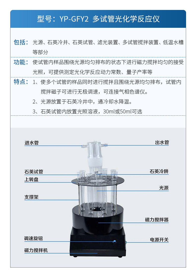 | YP-GFY2 多试管反应器 | 包括:光源、石英冷井、石英试管、滤光装置、多试管搅拌装置、低温水槽等部分。 功能:使试管内样品围绕光源均匀排布的状态下进行磁力搅拌均匀的接受光照,可提供测定光化学反应动力常数、量子产率等 特点:1、使多个试管的样品同时进行搅拌且围绕光源均匀排布,试管内搅拌磁子可进行无极调速,可连接气相色谱仪。 2、光源放置于石英冷井中,通冷却水降温。 3、石英试管内放置光照溶液,30ml或50ml可选 |