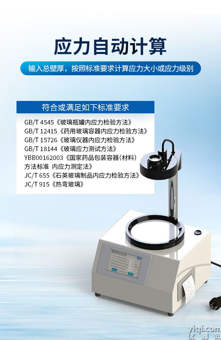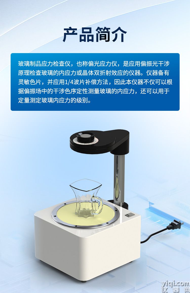玻璃制品应力检查仪,也称偏光应力仪,是应用偏振光干涉原理检查玻璃的内应力或晶体双折射效应的仪器。仪器备有灵敏色片,并应用1/4波片补偿方法,因此本仪器不仅可以根据偏振场中的干涉色序定性测量玻璃的内应力,还可以用于定量测定玻璃内应力的级别。