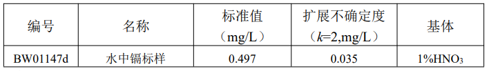 本标准物质用于水中镉的分析测试及宣贯的分析方法确认与评价、仪器校准等实验室质量控制。