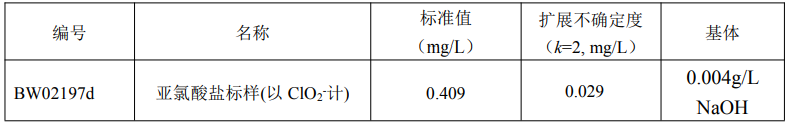 四、 稀释方法、标准值及扩展不确定度本标准品应按以下程序稀释后方可使用:用清洁干燥的移液管从安瓿瓶中准确移取 10.0mL 浓样至 250mL 容量瓶中,用 0.004g/L NaOH 溶液稀释定容至刻度,混匀后立即使用。稀释后的标准值和扩展不确定度为:
