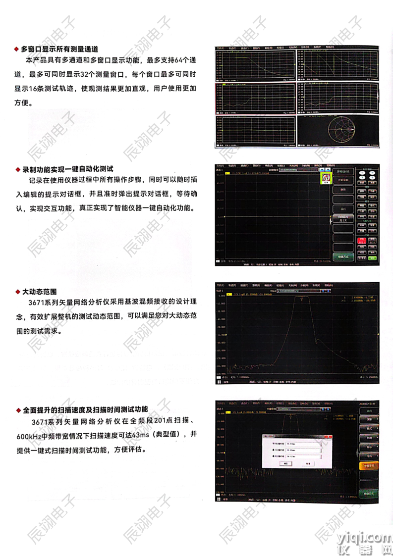 本产品具有多通道和多窗口显示功能,最多支持64个通道,最多可同时显示32个测量窗口,每个窗口最多可同时显示16条测试轨迹,使观