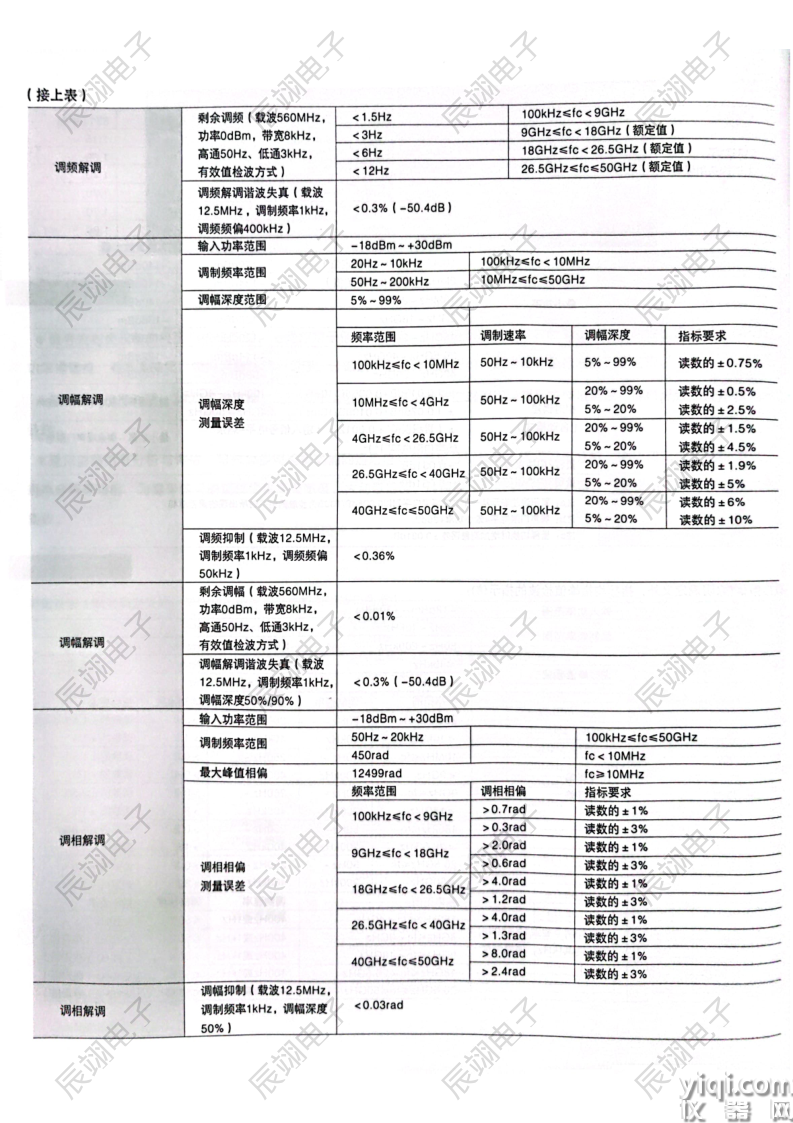 调制参数:AM、FM和φM的载波频偏、调制频率、调幅深度、调频频偏、调相相偏、总谐波失真(THD)、