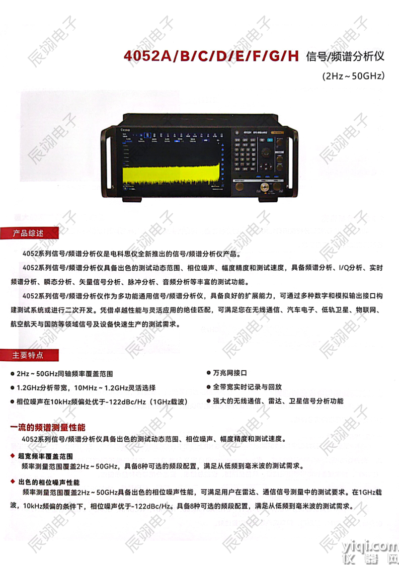 Ceyear 4052系列信号/频谱分析仪是电科思仪全新推出的信号/频谱分析仪产品。具备出色的测试动态范围、相位噪声、幅度精度和测试速度,具备