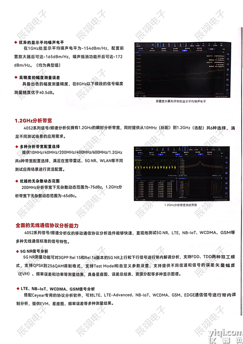 在1GHz处显示平均噪声电平为-154dBm/Hz,配置前置放大器后可达-167dBm/Hz,噪声抵消功能开后可达-170dBm/Hz。(均为典型值)
