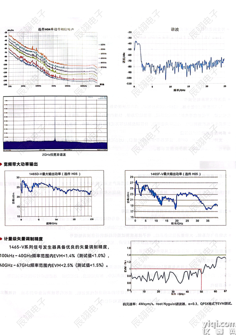 1465-V系列信号发生器具备优良的矢量调制精度,100kHz~40GHz频率范围内EVM<1.4%(测试值<1.0%),40GHz~67GHz频率范围内EVM<2.5%