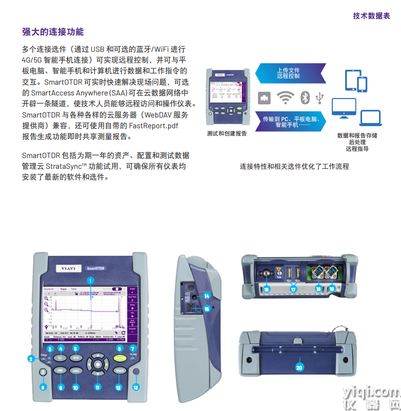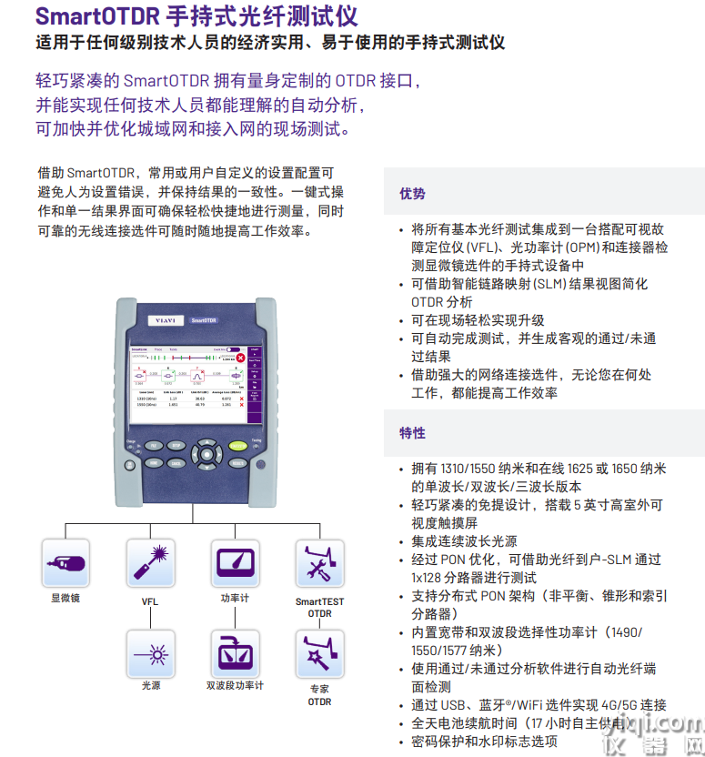 产品详情 SmartOTDRTM 基础手持式光纤测试仪是一款适用于任何级别技术人员的、经济实惠的、易于使用的仪表,通过可靠的无线连接选件,可随时随地提高工作效率。它将所有基础光纤测试需求, OTDR 测量、光纤端面分析、光损耗测试功能和可视故障定位功能整合到一台设备中。 优势