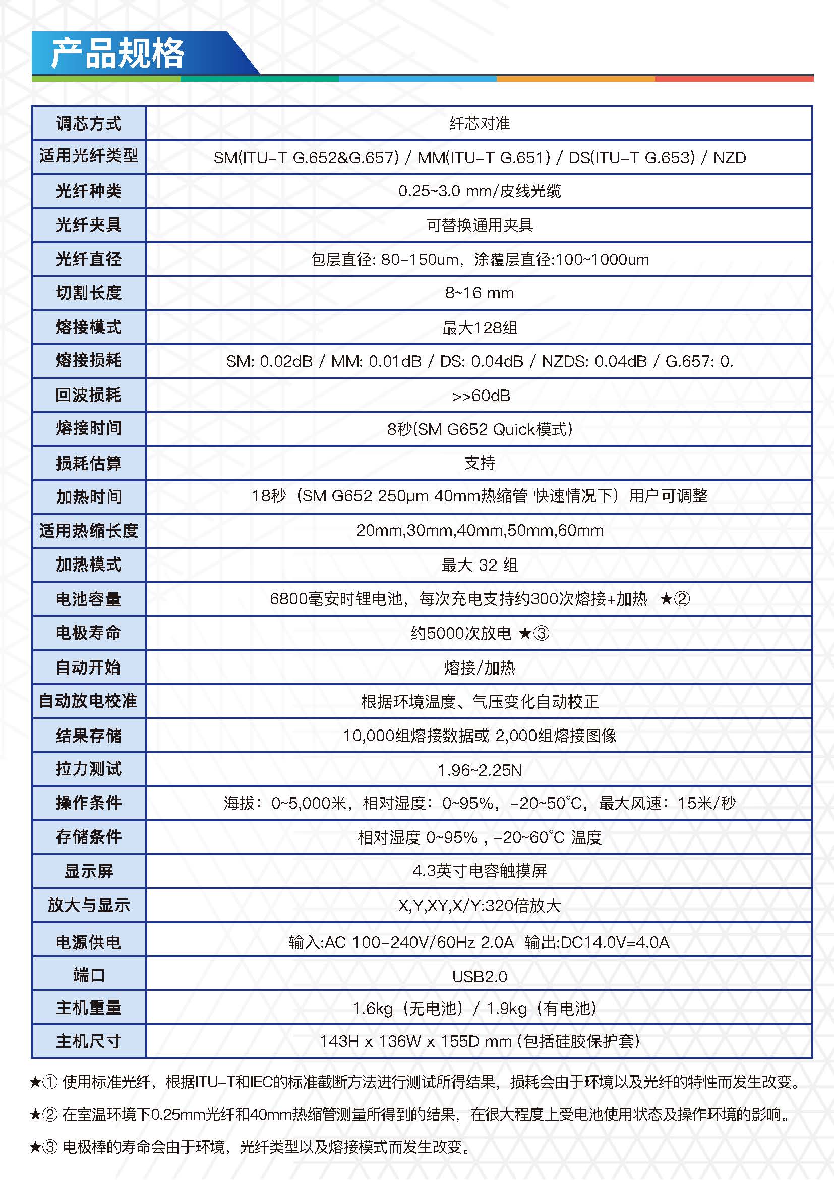 核心特点· 四马达 中干线熔接机· 4.3英寸电容触摸屏 · 纤芯对准,纤芯可见· 全自动熔接 & 全自动加热 · 支持300次熔接+加热循环· 电极寿命约5000次 (可更换)· 创新性免工具更换电极棒 · 6800毫安时锂电池, 满电约支持300次熔接+加热循环 · 抗震、防摔、防雨设计· 3年质保