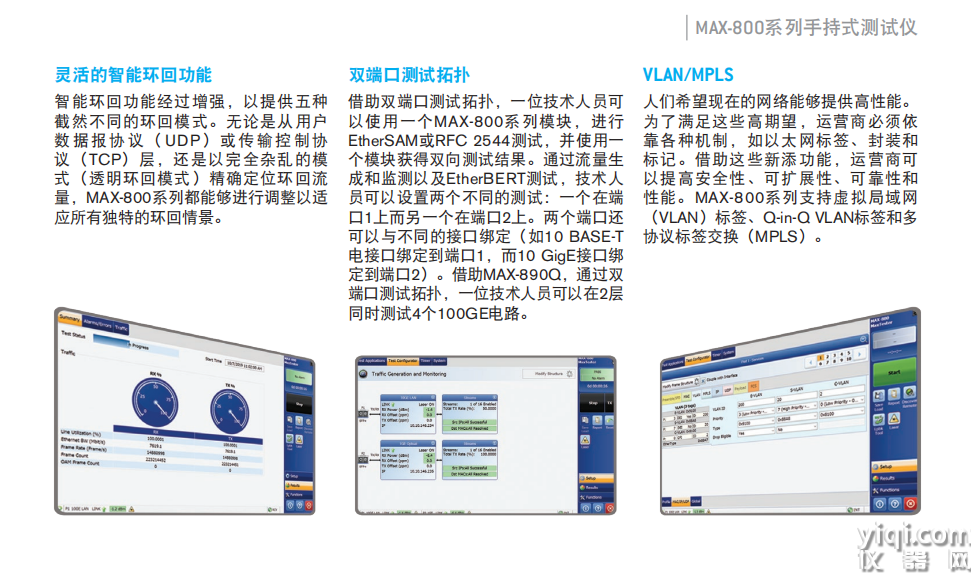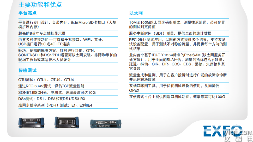 产品详情 速率高达10GE的以太网测试 根据ITU-T Y.1564进行服务配置和服务性能测试,包括EBS、CBS和EMIX。 依照RFC 2544之规定,可以测量吞吐量、背对背、丢帧和延迟;帧长:RFC定义或用户可在1个和10个之间进行配置 采用多点触控的8英寸彩色显示屏,提供非常直观的GUI 轻巧、便携的解决方案,针对运营商以太网安装、排障和维护的现场工程师人员设计 在便携式平台上提供双端口测试功能,速率最高可达10G 以一流的精准度进行EtherSAM(ITU-T Y.1564)服务配置和性能测试,加快以太网服务激活速度,并支持远程发现、智能环回和双测试设备功能 内置多种连接功能,可通过千兆接口、WiFi、蓝牙、3G或4G LTE连接
