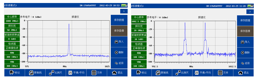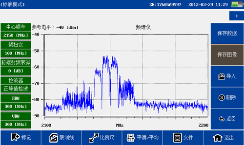 频谱分析模块覆盖频率范围300MHz-4GHz,100dB超大动态范围,-130dBm平均噪底@RBW=1kHz,提供频谱测试,干扰排查等测试。 1)频谱测量功能