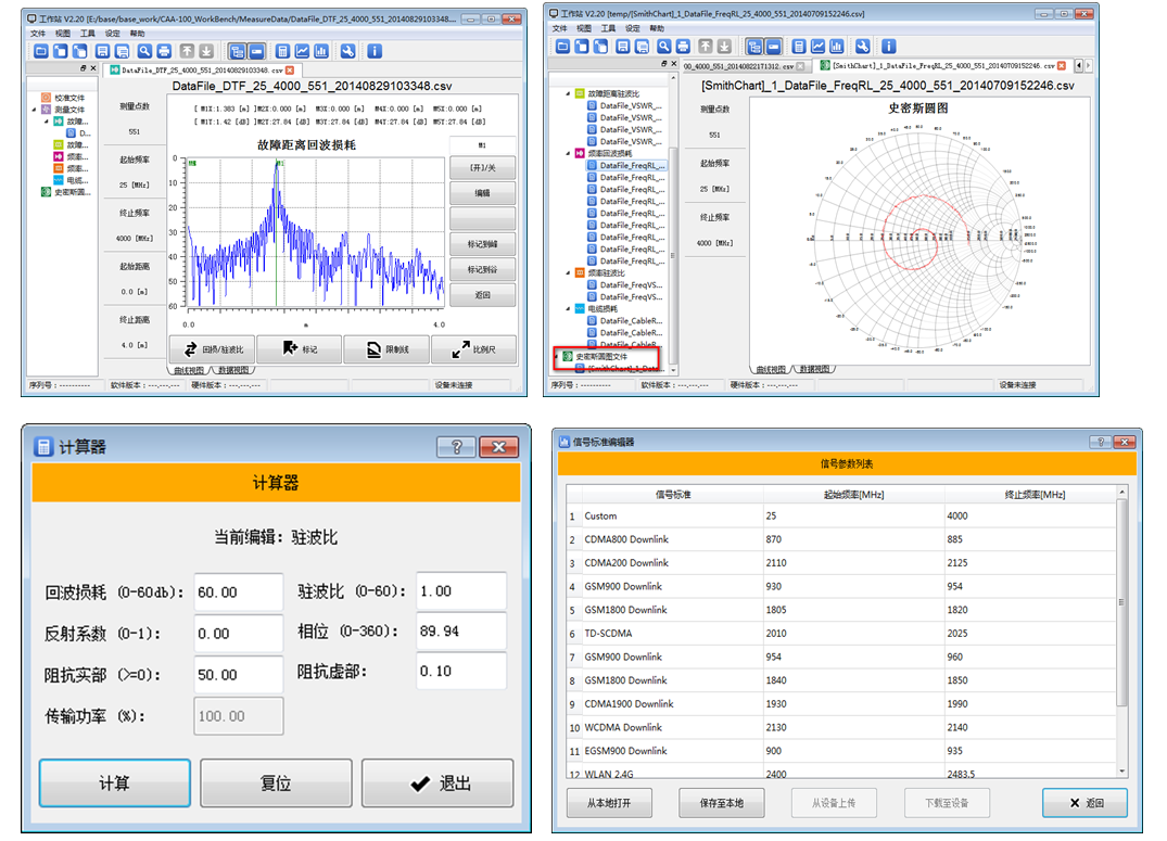 2)应用工具功能 ● Distance-To-Fault功能 ● 转换成史密斯圆图功能 ● 计算器 ● 信号标准编辑 ● 电缆参数编辑