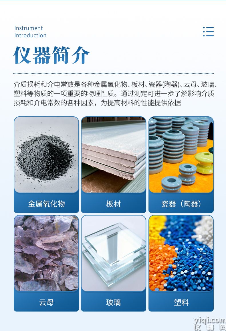介质损耗和介电常数是各种金属氧化物,板材,瓷器(陶器),云母,玻璃,塑料等物质的一项重要的物理性质。通过测定可进一步了解影响介质损耗和介电常数的各种因素,为提高材料的性能提供依据。