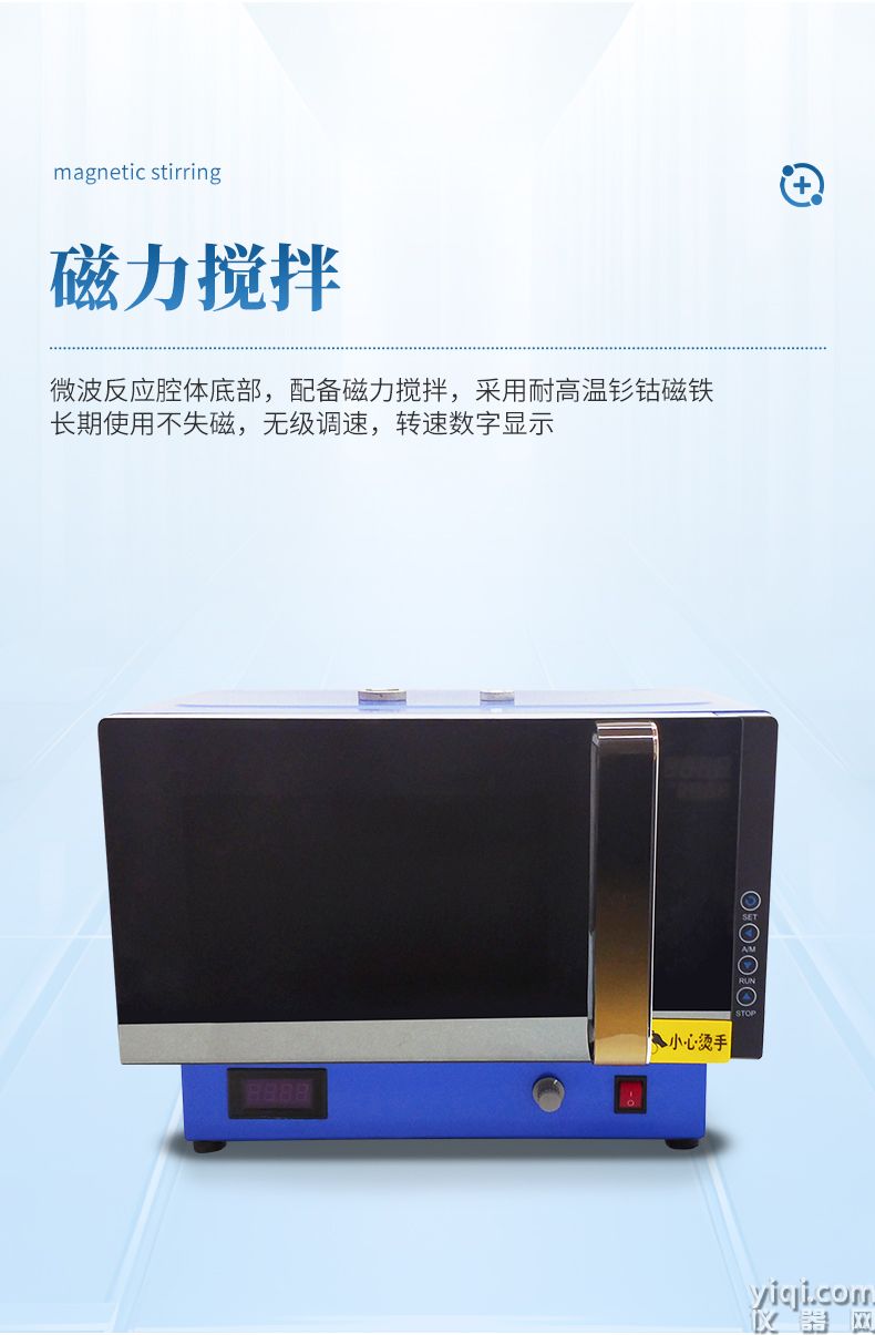 微波反应腔体底部,配备磁力搅拌,采用耐高温钐钴磁铁,最大工作温度可达350℃,长期使用不失磁,无级调速,转速数字显示。