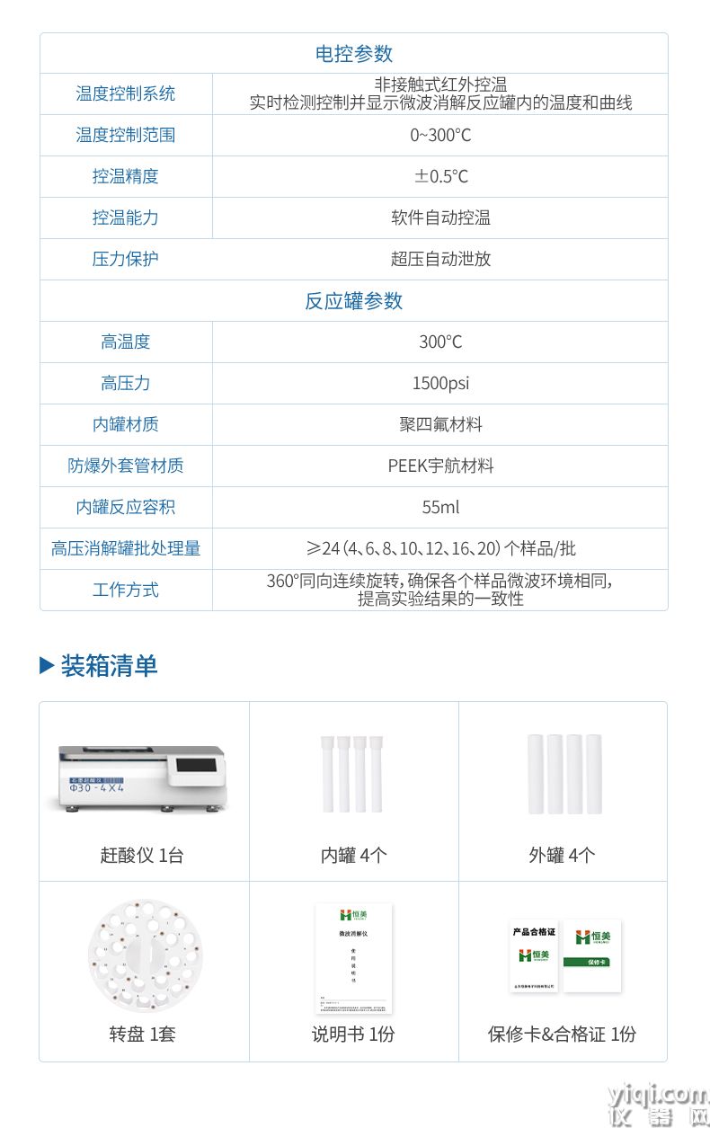 技术参数:温度控制系统:非接触式红外控温,实时检测控制并显示微波消解反应罐内的温度和曲线。
