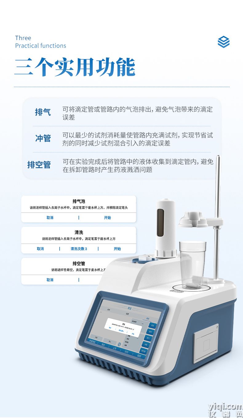 (1)排气,可将滴定管或管路内的气泡排出,避免气泡带来的滴定误差;