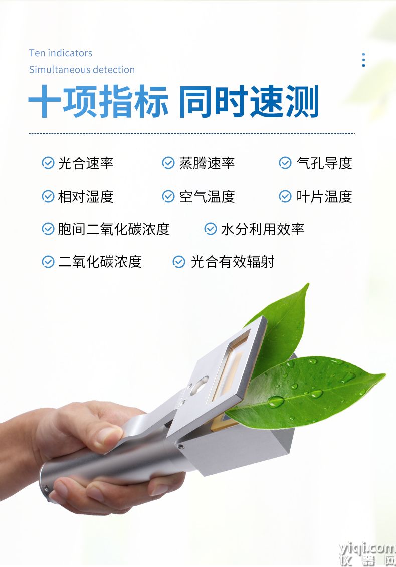 多功能:同时测定光合速率、蒸腾速率、胞间二氧化碳浓度、气孔导度和水分利用效率,以及二氧化碳浓度、相对湿度、光合有效辐射和空气温度、叶片温度十项指标