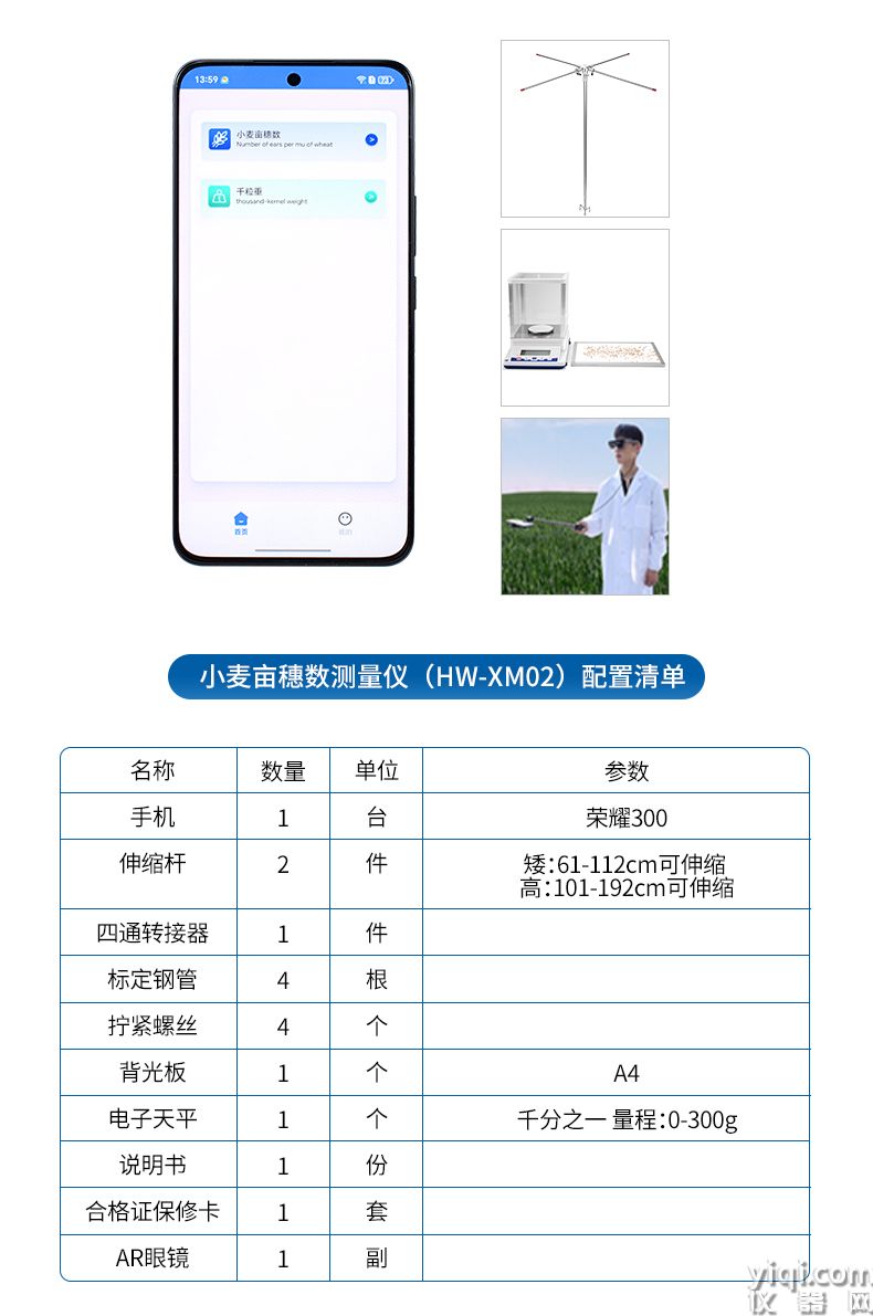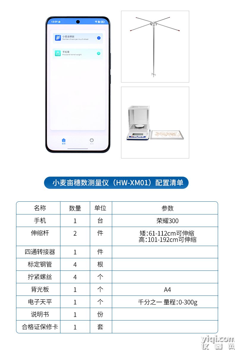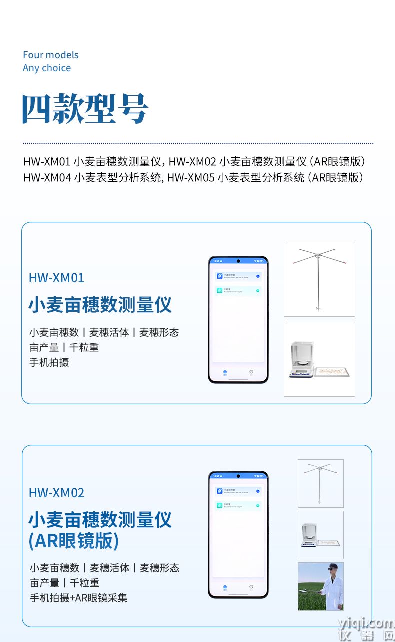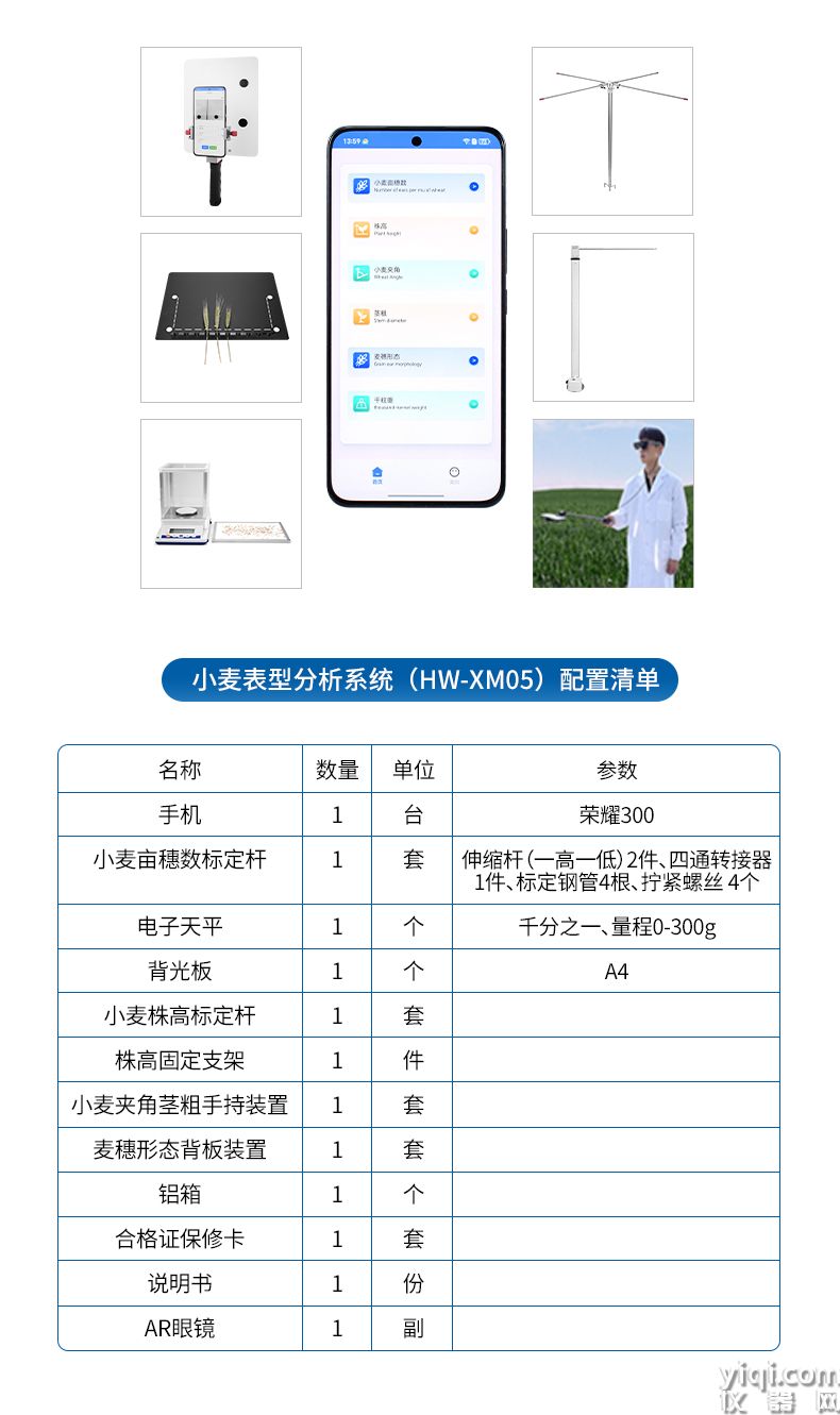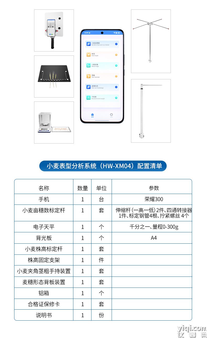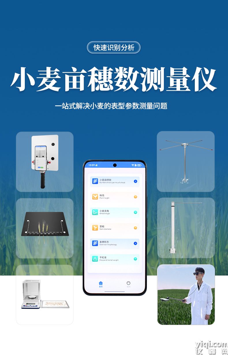4)麦穗形态测定仪依托手机视觉技术,通过AI图像矫正算法一键获取穗长、小穗数等关键指标。全系统实现田间快速取样、批量分析及数据互联,为育种优化、产量预测和功能基因解析提供智能化解决方案。