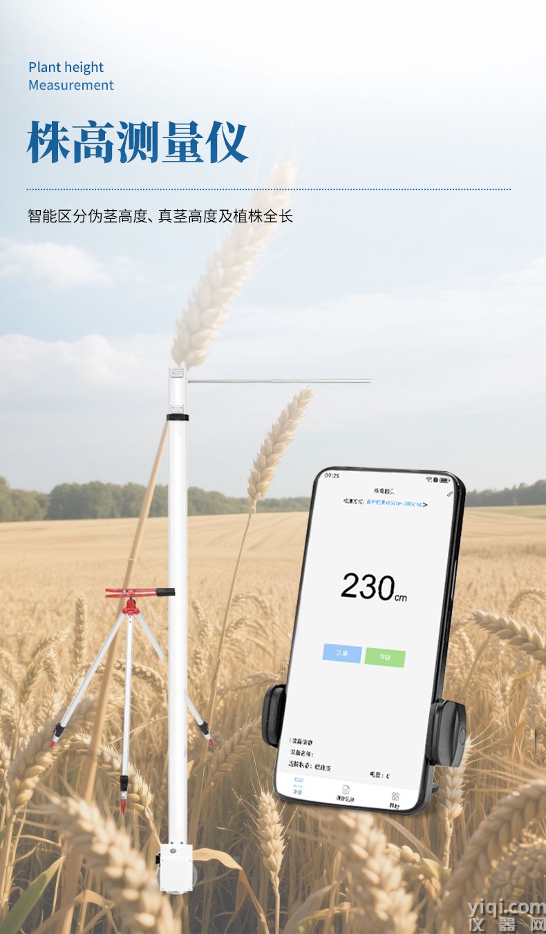 2)株高测量仪依据不同生长期标准(幼苗期/拔节期/灌浆期等),智能区分伪茎高度、真茎高度及植株全长;