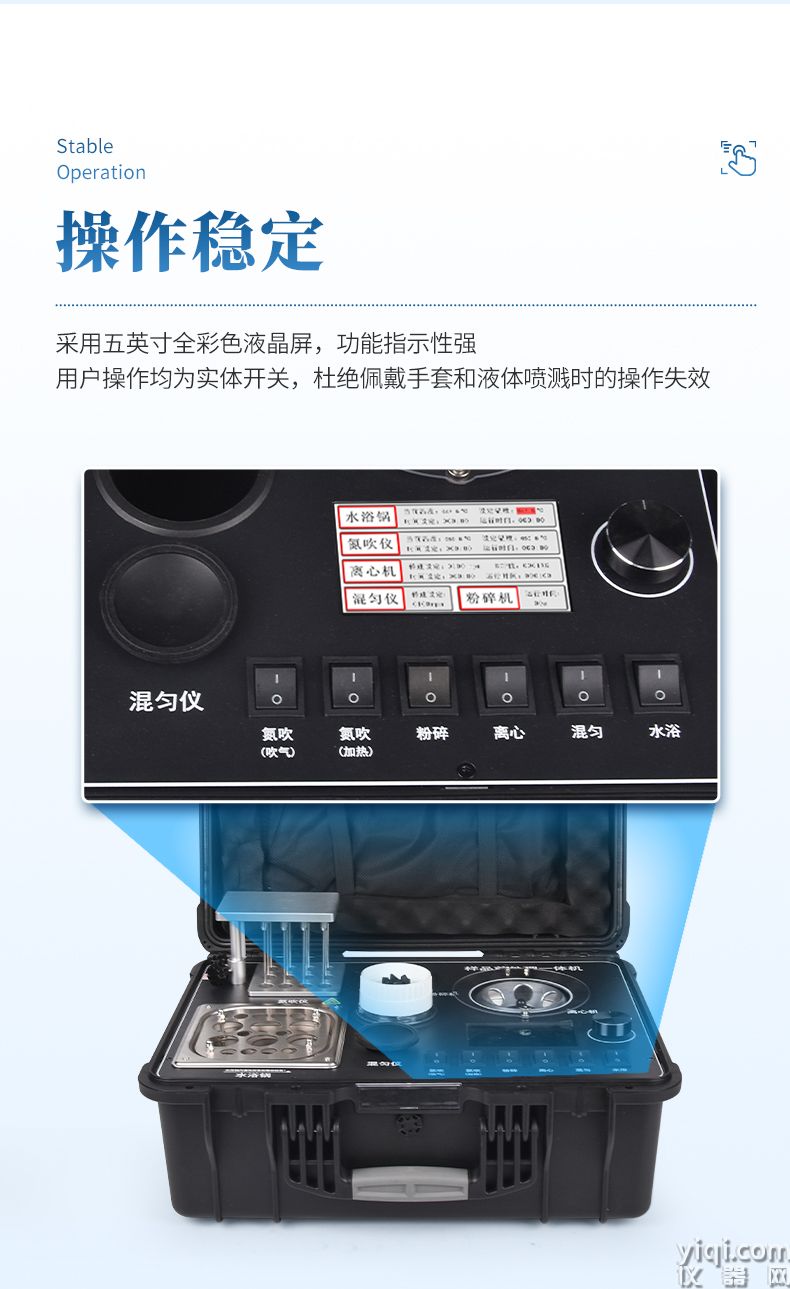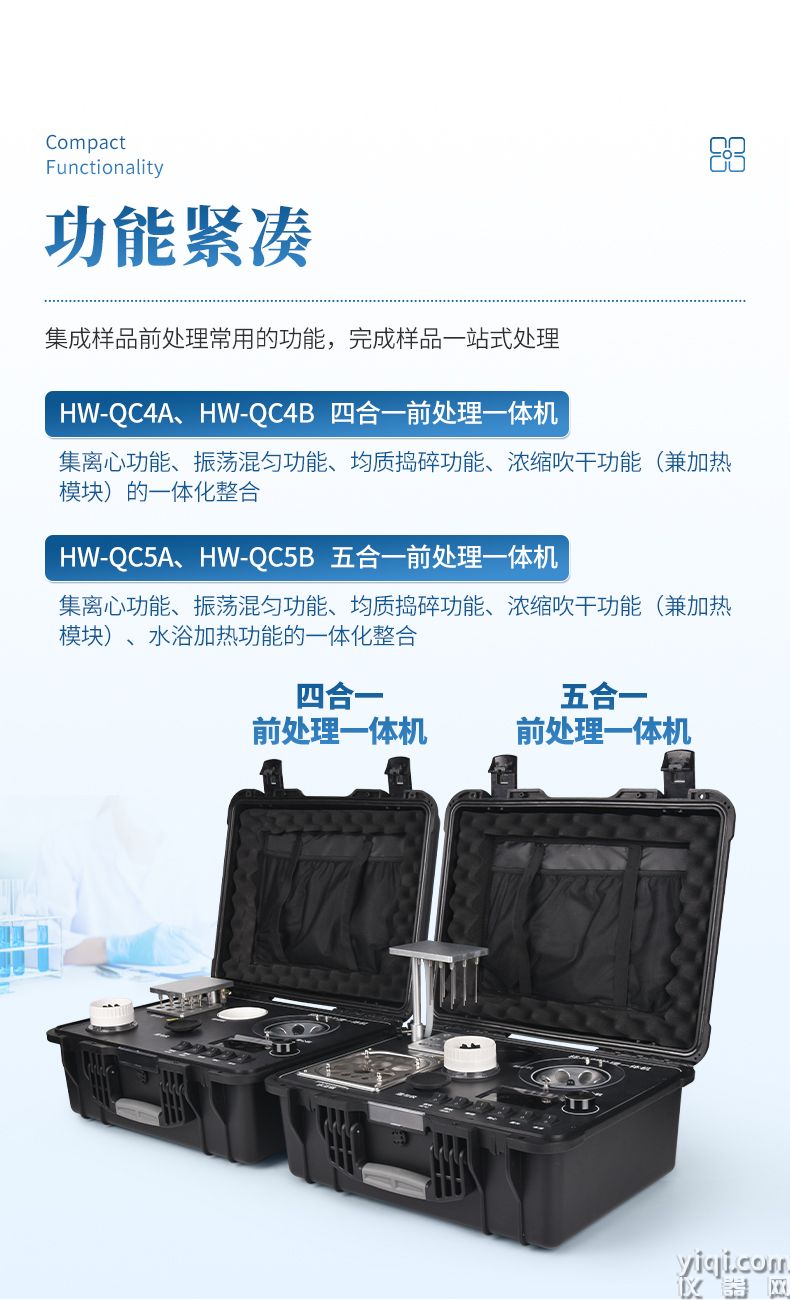 应国内用户的实际需求,自行研制开发的新型仪器——QC05型样品前处理一体机。样品前处理集成箱将样本前处理过程中样品浓缩、水浴恒温、离心分层、均质、振荡混匀等步骤所需设备进行集成,仅需一台样品前处理集成箱设备即可完成所有样本前处理过程,并且方便携带,不仅适用于现场检测使用,还可用于色谱、质谱等分析样品的纯化和制备。