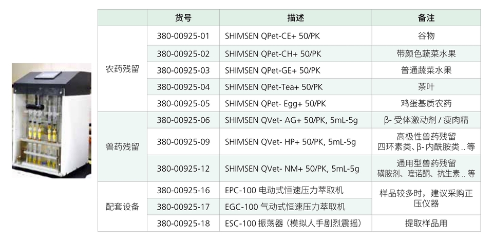 ● 针对样品基质不同,岛津提供多农残、多兽残净化小柱,分别是 SHIMSEN QPet、SHIMSEN QVet。
