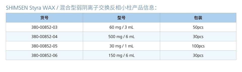 以苯乙烯一二乙烯基苯和亲水性基团共聚物为基体,导入弱碱性官能团,同时具有反相和阴离子交换作用。WAX适合pKa值小于1的强酸性化合物的富集净化。