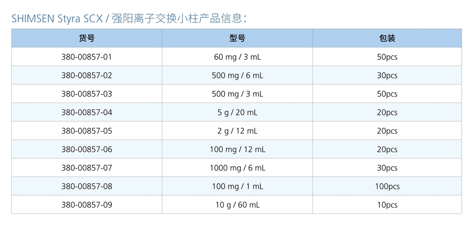 将苯磺酸丙基与硅胶颗粒结合的固相萃取小柱。磺酸基团极易解离而呈阴离子状态,具有较强的阳离子交换性能。并且由于苯环的存在,吸附剂还具有非极性,能与化合物发生非极性相互作用,适合碱性化合物的分离。