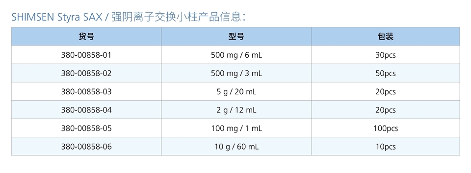 三甲基氨丙基键合硅胶固相萃取小柱。季铵基团始终呈阳离子态,因而具有较强的阴离子交换功能,对阴离子型有机化合物(比如含有羧基、酚羟基的化合物)具有选择性的保留。由于季铵基团上的碳链较短,吸附剂的非极性相互作用较弱。